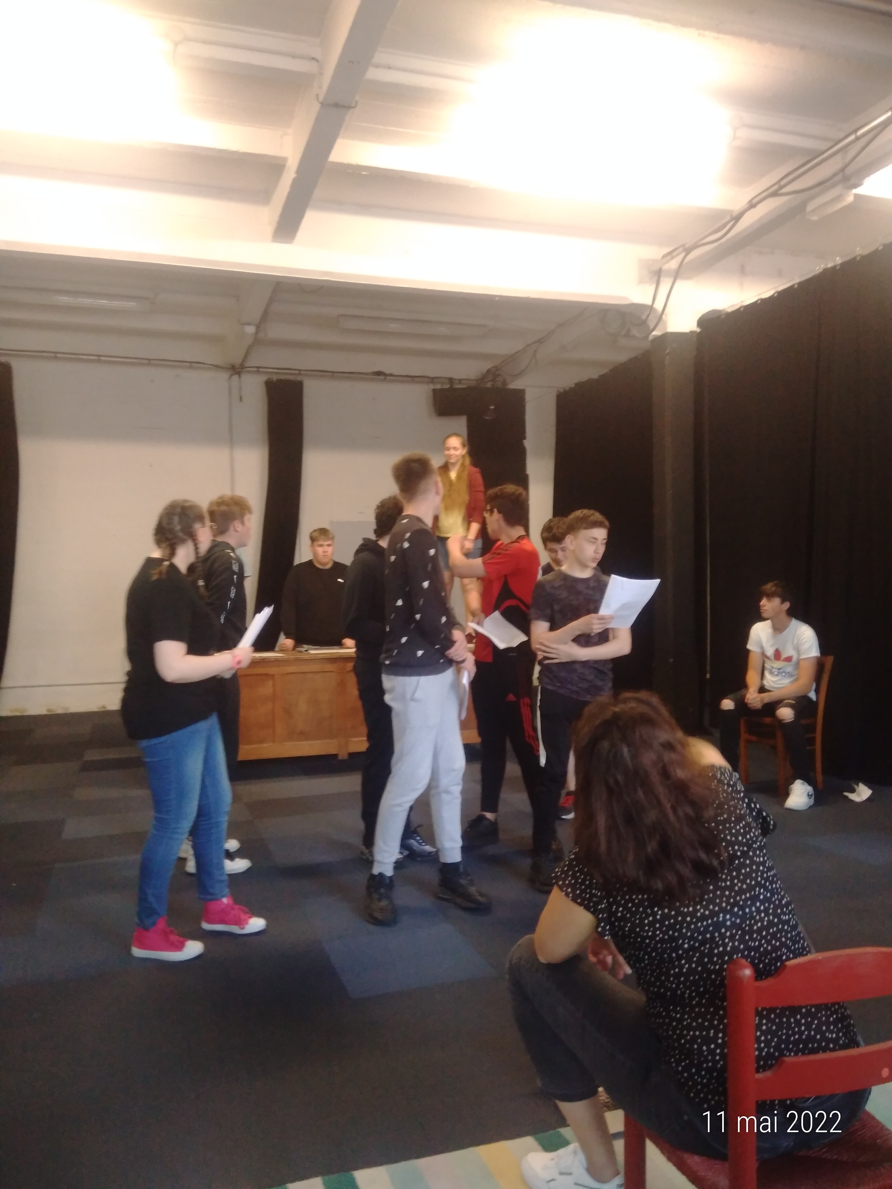 La mise en voix finale, sur la scène du théâtre de la ville, permit aux élèves de révéler leur lecture et surtout leur interprétation du texte flaubertien, depuis les premières répétitions jusqu’à la représentation en public.
